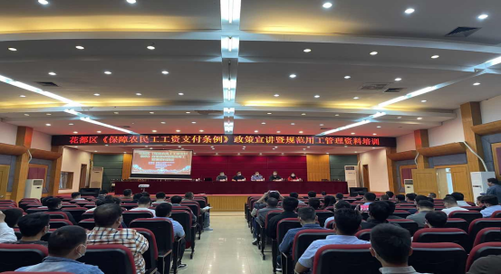 培训前,花都区人力资源和社会保障局劳监执法大队大队长对贯彻落实《保障农民工工资支付条例》及规范用工管理提出了要求。培训中,花都区人力资源和社会保障局劳监执法大队工作人员对《保障农民工工资支付条例》进行宣讲,并就工地用工台账资料、安薪花都码、花都区建设领域违法企业与不良班组通报机制等相关内容做了讲解;并对工人工资保证金(保函)业务办理做了详细介绍;花都区住房和城乡建设局质监站工作人员对工地实名制规定进行宣讲。