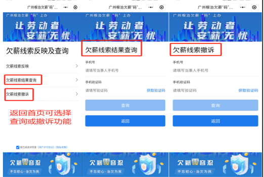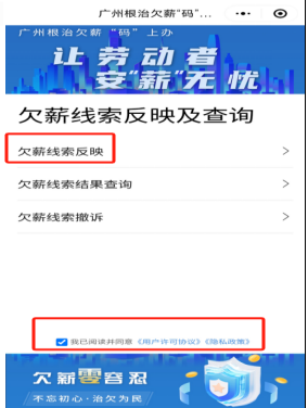 方式二:在微信搜索“广州根治欠薪码上办”小程序,进入小程序后勾选同意相关协议,选择“欠薪线索反映”进入模块,如下图: